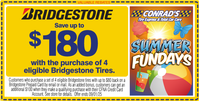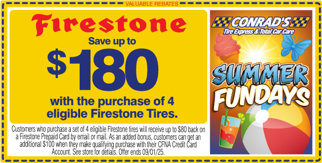 Receive a $60 Firestone Prepaid Mastercard with the purchase of four (4) Firestone All Season tires. Receive an additional $60 on the Firestone Prepaid Card by using your CFNA credit card. Offer good November 1 - December 30, 2025. Limit 1 reward per each set of tires purchased, limit 2 rewards per household. Offer excludes Discount Tire purchases. Certain restrictions apply. Void where prohibited. Not redeemable for cash. All submissions must be filed online at FirestoneRewards.com and received no later than January 10, 2026.